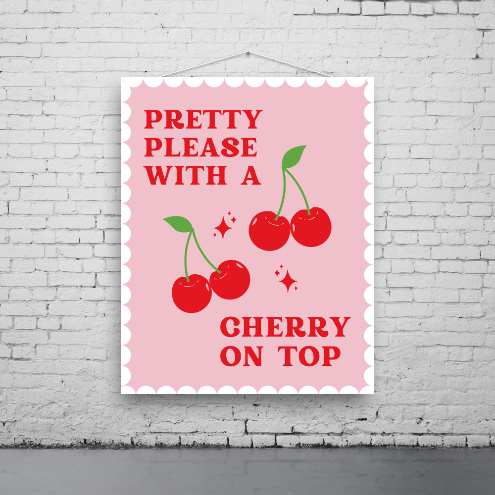Add a touch of flirty to your space with the "Pretty Please" art print by dropcreative. Featuring a vibrant cherry design and a playful message.